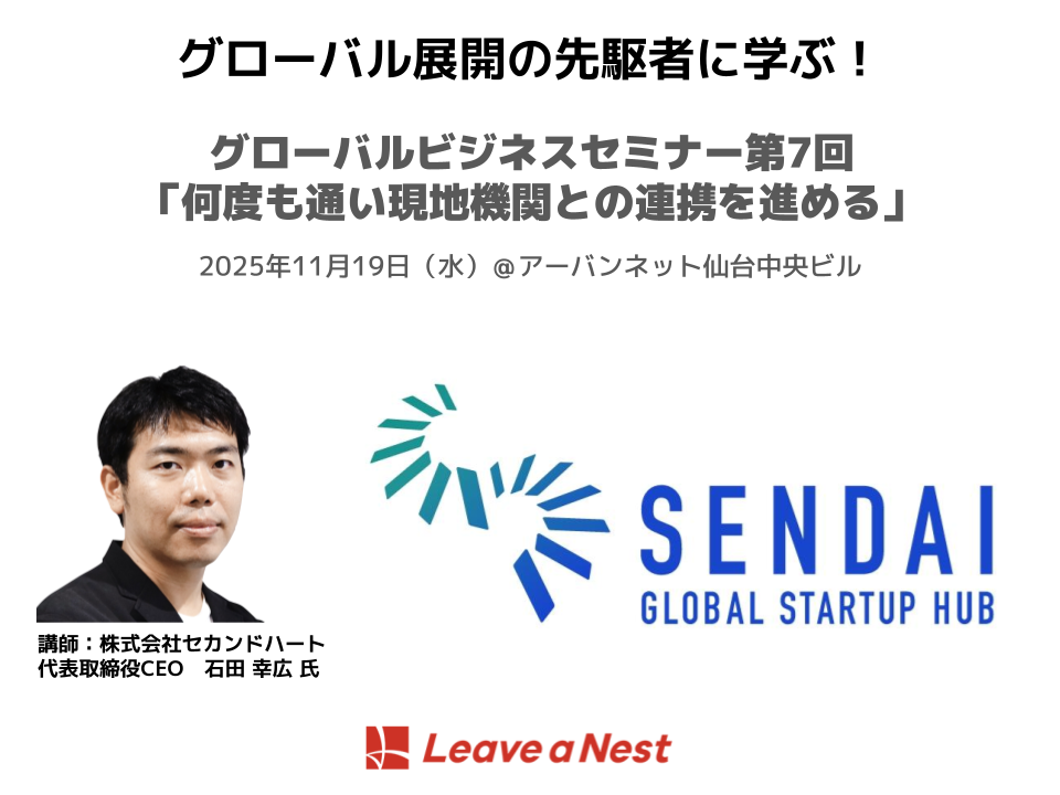 株式会社リバネスは仙台市の委託を受け、仙台・東北から世界の課題解決に挑むスタートアップを支援する「仙台・東北エクスパンションプログラム(略称:STEP)」を推進しています。本取り組みの一環として、仙台・東北から海外展開を目指すスタートアップ、新規事業を模索する地域企業の方々に対して、グローバルビジネスセミナーを(「グローバル展開の先駆者に学ぶ!」シリーズ)を8月から12月にかけて7回程度開催します。